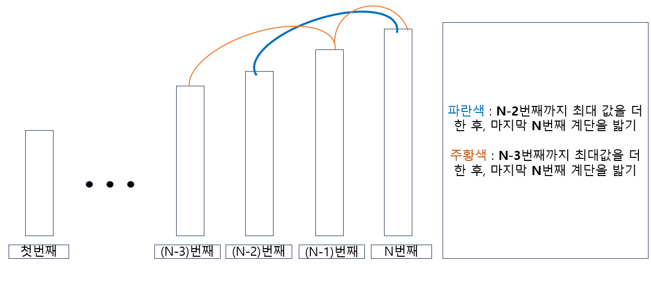 2. 마지막 계단을 N번째 계단이라고 가정하였을 시, N-3 + N-1 + N번째 계단을 밟는 경우